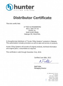 DISTRIBUTOR CERTIFICATION Hunter Filling Systems Distributor Certificate Alfa Laval Distributor Certificate SuperKlean Washdown Products JEC Limited LP Equipment Sdn Bhd TapTone - LP Equipment SB Malaysia TC07